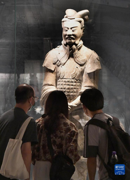 9月4日,参观者在“繁星盈天——中国百年百大考古发现展”上观看展品“高级铠甲军吏俑”。新华社记者 李安 摄
