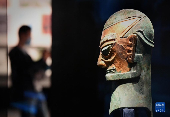这是9月4日在“繁星盈天——中国百年百大考古发现展”上拍摄的“戴金面罩青铜人头像”。新华社记者 李安 摄