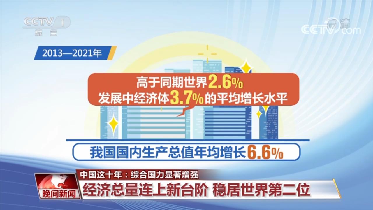 2013—2021年,我国国内生产总值年均增长6.6%,高于同期世界2.6%和发展中经济体3.7%的平均增长水平。2021年突破110万亿元,达114.4万亿元,按不变价计算为2012年的1.8倍。按年平均汇率折算,2021年,我国经济总量占世界经济的比重达18.5%,比2012年提高7.2个百分点,稳居世界第二位。2013—2021年,我国对世界经济增长的平均贡献率超过30%,居世界第一。