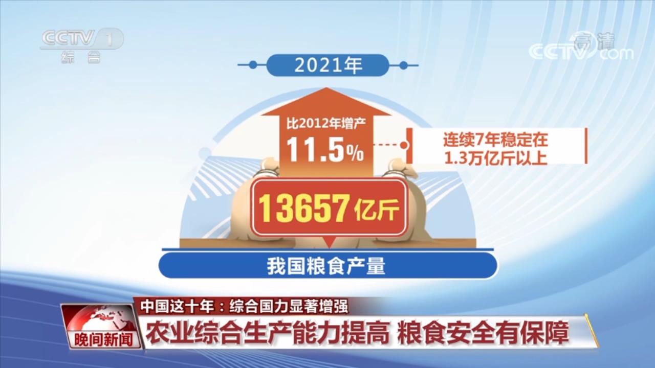 2021年,我国粮食产量13657亿斤,比2012年增产11.5%,连续7年稳定在1.3万亿斤以上。2015—2021年,谷物总产量保持在6亿吨以上,稳居世界首位;肉类、水果、花生、籽棉、茶叶等农产品产量,均保持世界第一。农业科技创新和机械化步伐加快。2021年,农业科技进步贡献率超过60%,农作物耕种收综合机械化率超过70%。