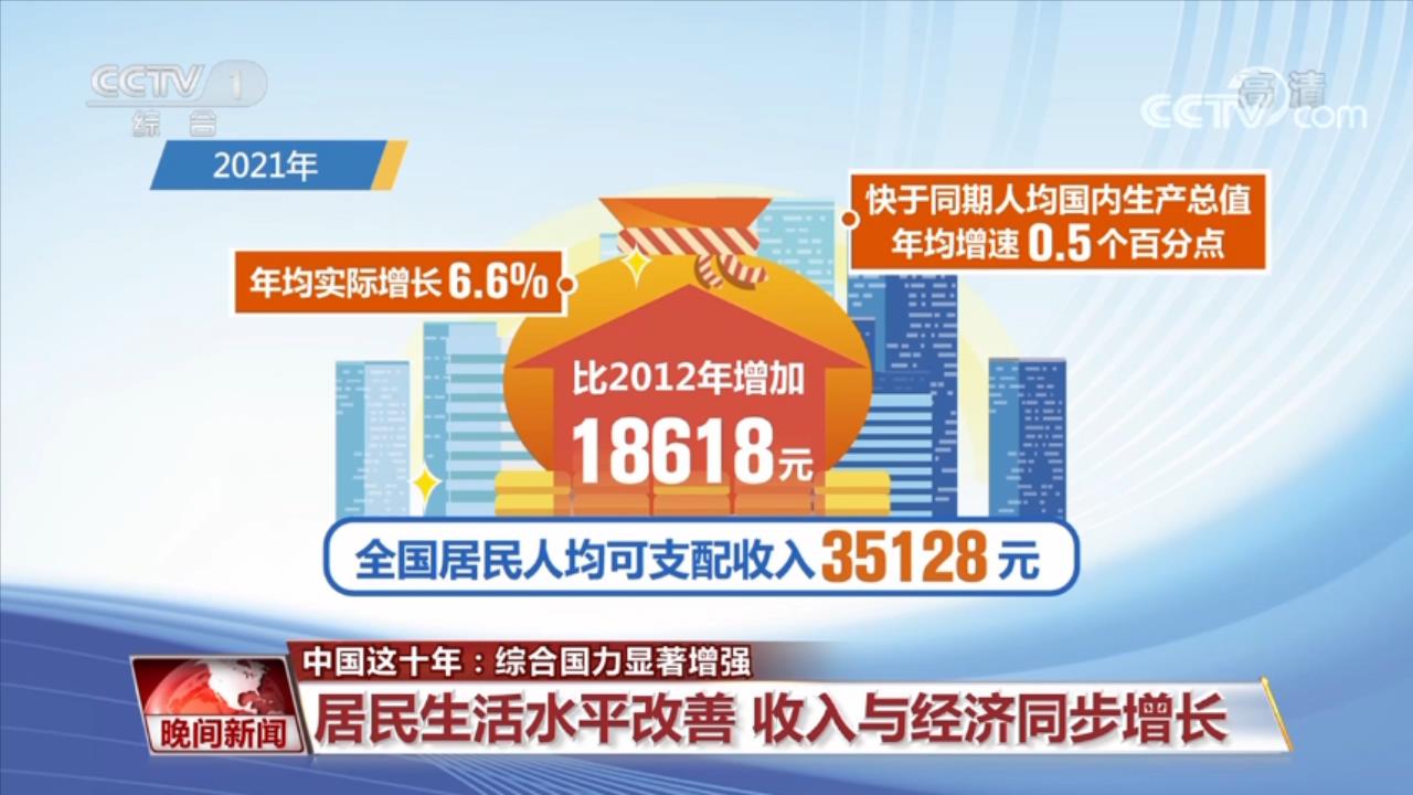 2021年,全国居民人均可支配收入35128元,比2012年增加18618元,年均实际增长6.6%,快于同期人均国内生产总值年均增速0.5个百分点。居民消费水平不断提升。2021年,全国居民人均消费支出24100元,比2012年增加12046元,年均实际增长5.9%。全国居民每百户家用汽车、移动电话拥有量分别为41.8辆、259.1部,分别比2013年增长147.3%、27.5%。