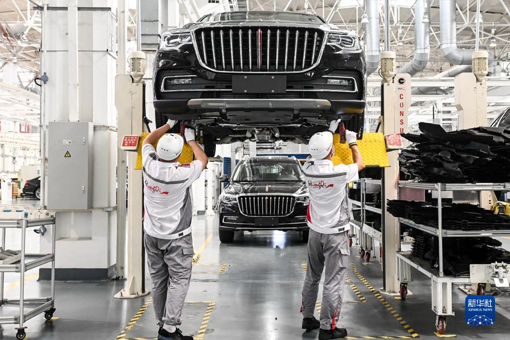 工人在位于吉林长春的一汽红旗工厂总装车间内装配车辆(2021年7月1日摄)。 新华社记者 颜麟蕴 摄
