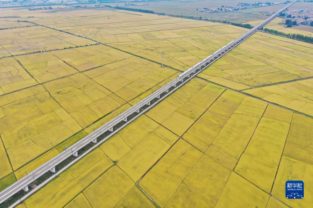 高铁列车从吉林省公主岭市沃野间驶过(2021年9月19日摄,无人机照片)。 新华社记者 张楠 摄