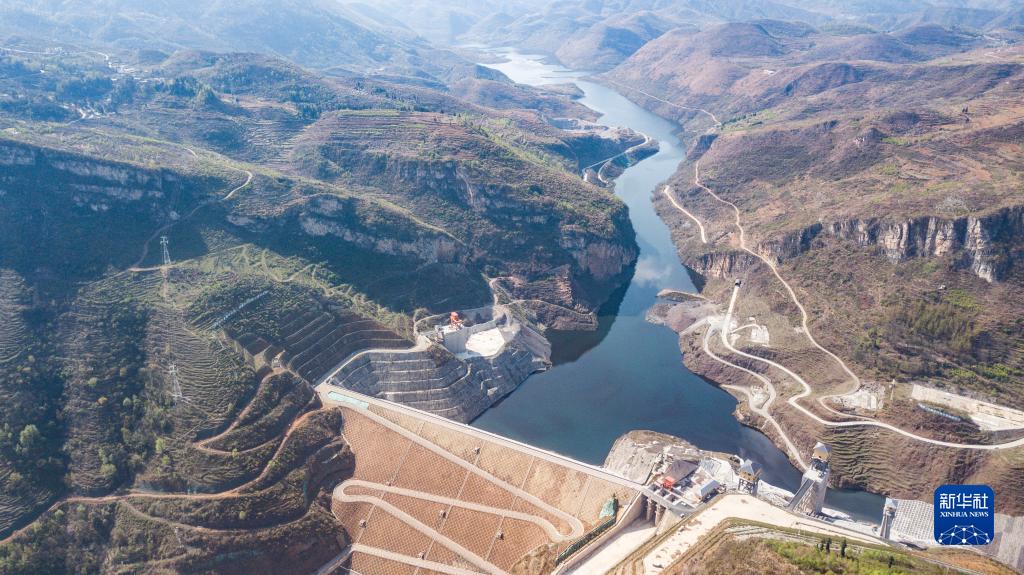这是在位于乌蒙山区的贵州省纳雍县六冲河畔拍摄的夹岩水利枢纽工程(2022年3月17日摄,无人机照片)。 新华社记者 陶亮 摄