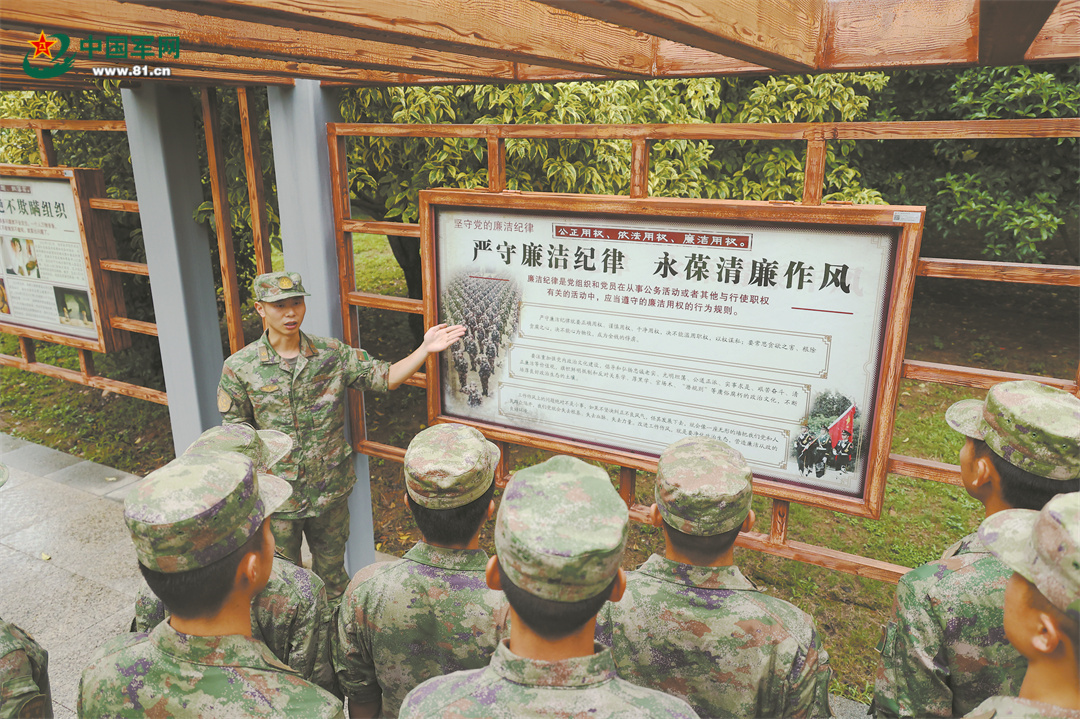 第72集团军某旅组织下连新兵在廉政文化长廊接受廉洁警示教育,帮助他们筑牢思想防线。陈泓泽 摄