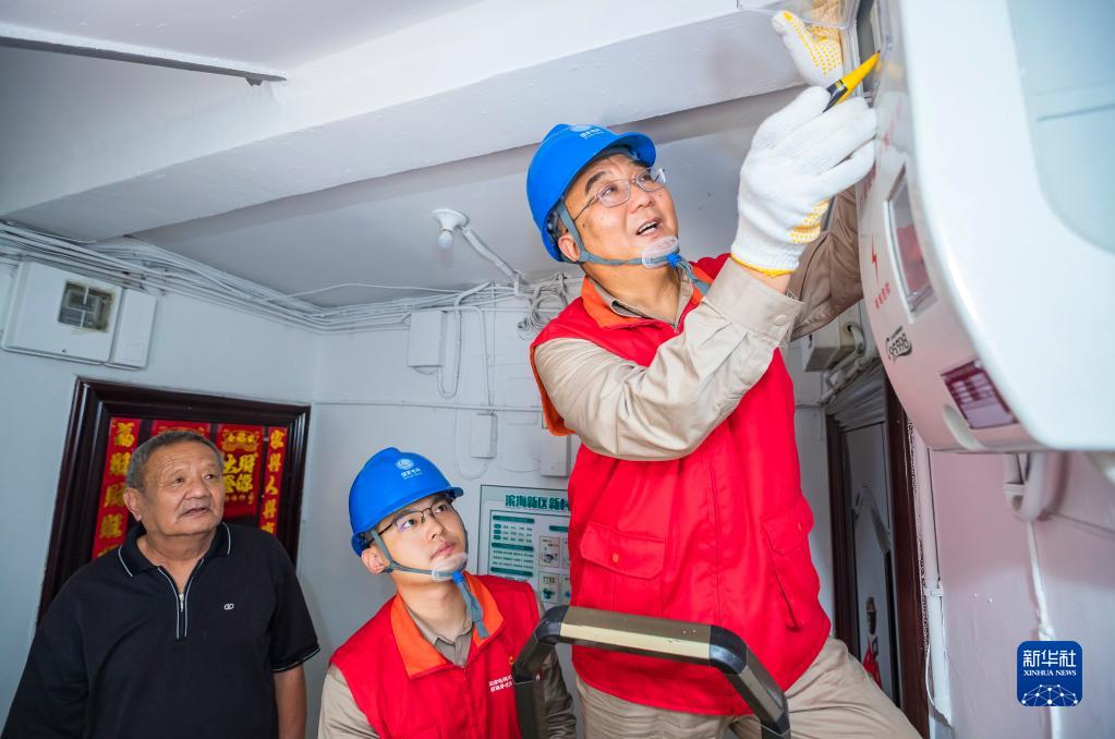 张黎明(右)带领国网天津滨海黎明共产党员服务队到天津市滨海新区丹东里小区为居民查看电表(2022年7月15日摄)。新华社发(李津 摄)