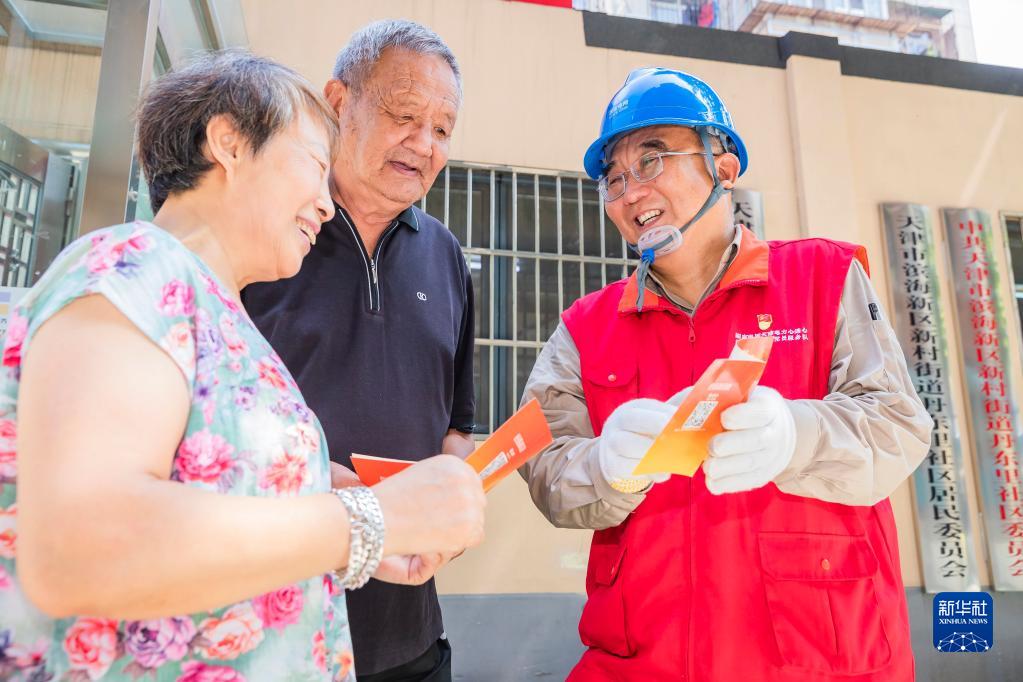 张黎明(右)在天津市滨海新区丹东里小区向居民宣讲安全用电常识(2022年7月15日摄)。新华社发(李津 摄)