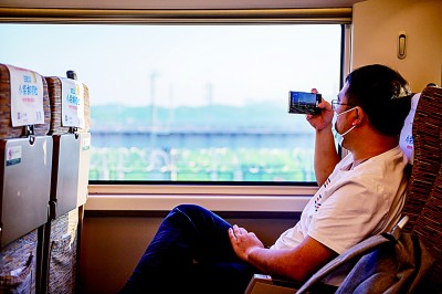 渝厦高铁益长段日前开通,在长沙首发的G6518次列车上,旅客拿手机拍摄窗外风景。新华社发