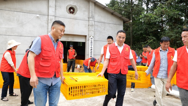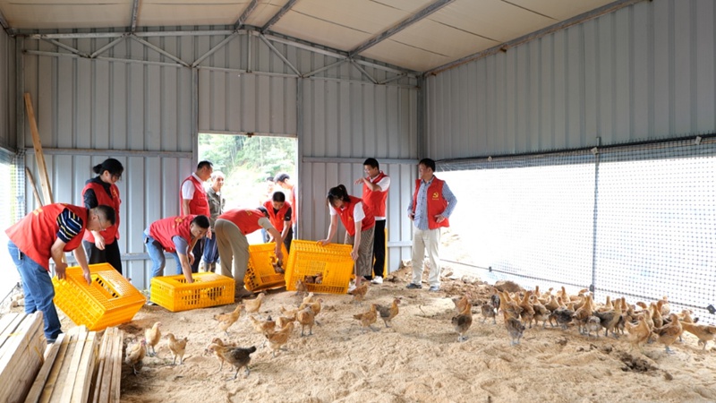 技术人员和村干部正在搬运小鸡仔。浙江省农业农村厅供图