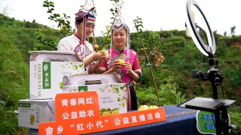 葛山村水果基地里正在进行一场农产品直播带货。景宁县委宣传部供图