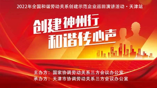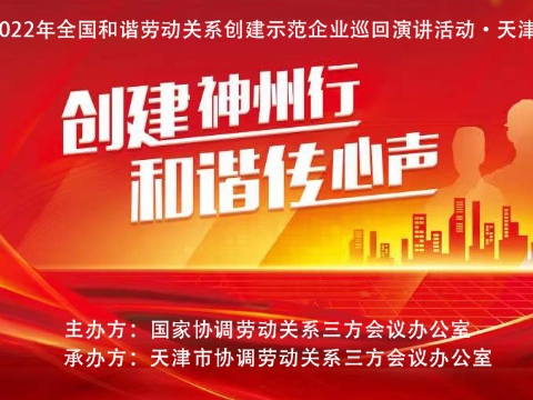直播回顾丨全国和谐劳动关系创建示范企业巡回演讲活动(天津站):创建神州行 和谐传心声(一) 创建神州行,和谐传心声!为进一步扩大和谐劳动关系创建活动影响力、传播力,展现天津市和谐劳动关系生动实践和昂扬向上的精神风貌,10月12日(星期三)下午14:30,天津市协调劳动关系三方会议办公室将组织开展天津市2022年全国和谐劳动关系创建示范单位巡回演讲。中工网首页、视频号、抖音等平台同步直播。