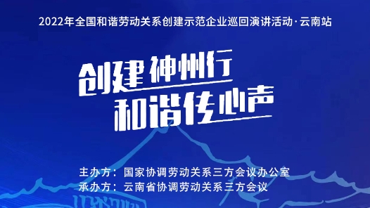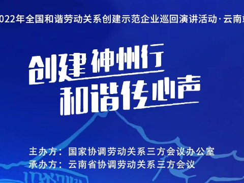 直播回顾丨全国和谐劳动关系创建示范企业巡回演讲活动(云南站):创建神州行 和谐传心声(一) 根据国家协调劳动关系三方会议部署,为进一步扩大和谐劳动关系创建活动影响力、传播力,展现和谐劳动关系生动实践和昂扬向上的精神风貌,10月13日(星期四)下午14:30,云南省协调劳动关系三方组织开展“2022年全国和谐劳动关系创建示范单位巡回演讲活动(云南站)。中工网首页、视频号、抖音等平台同步直播。
