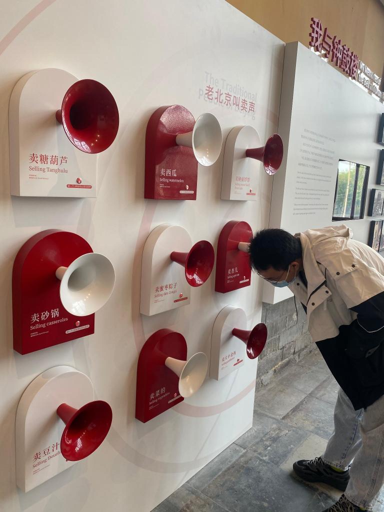 10月12日,一名记者在鼓楼一层“我的时间”展厅,通过墙面安装的一个个喇叭形听筒,聆听过去在钟鼓楼附近的老北京叫卖声。新华社记者 罗鑫 摄