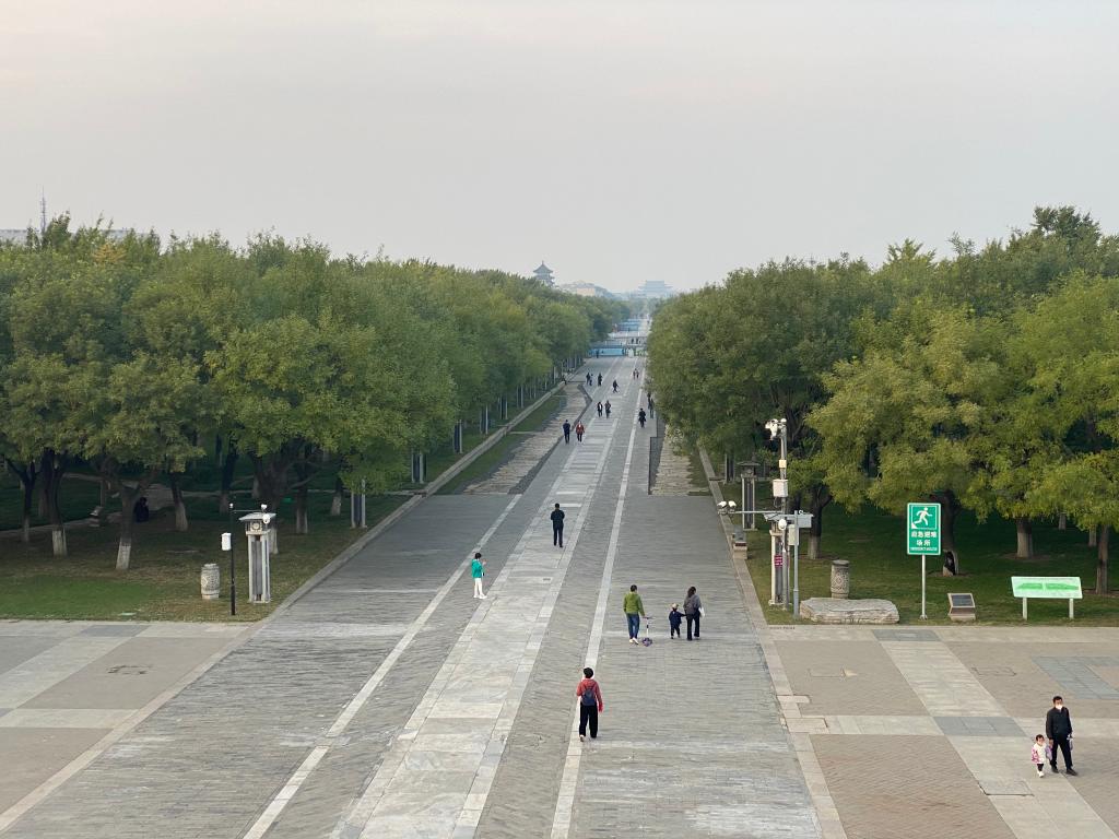 10月12日,记者们登上永定门城楼,眺望北京中轴线。新华社记者 罗鑫 摄