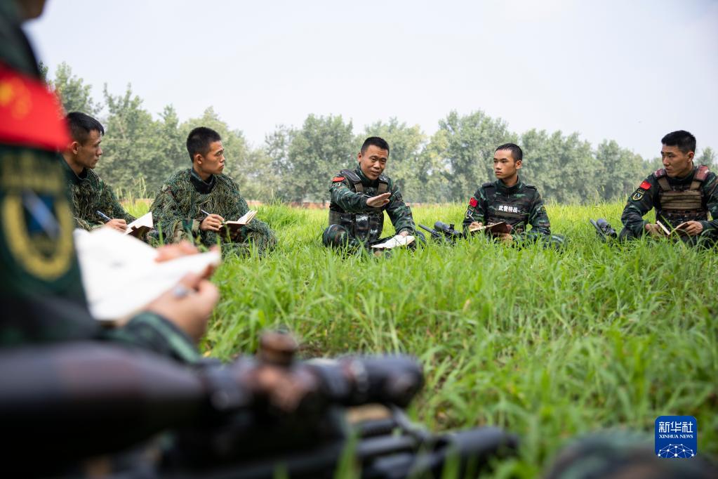 武警河北总队某部大队长李闯(右三)和特战队员进行理论研讨(2022年8月3日摄)。新华社发(江腾 摄)