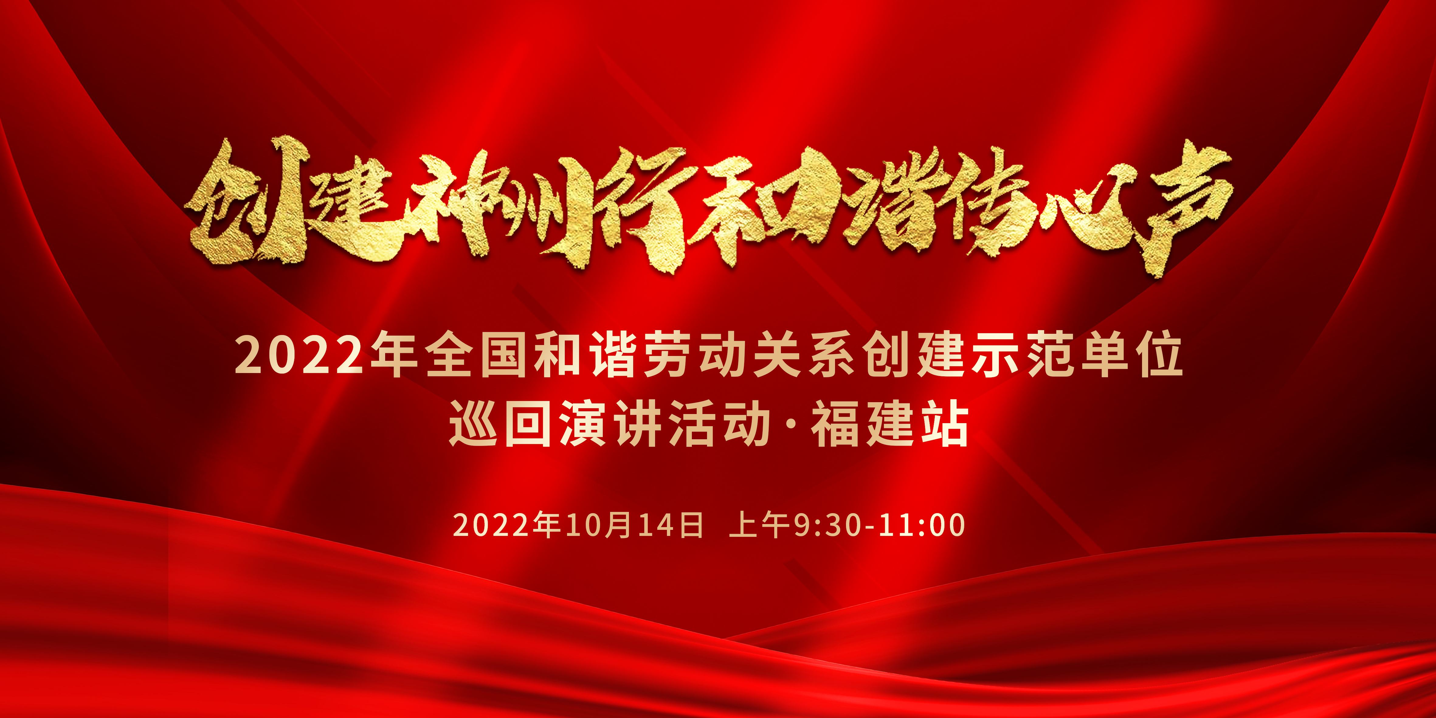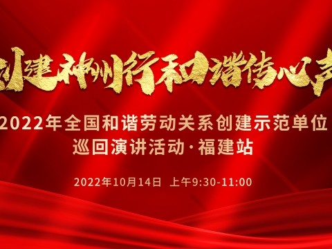 直播回顾丨全国和谐劳动关系创建示范企业巡回演讲活动(福建站):创建神州行 和谐传心声(一) 创建神州行,和谐传心声!为进一步扩大和谐劳动关系创建活动影响力、传播力,展现福建省和谐劳动关系生动实践和昂扬向上的精神风貌,10月14日(星期五)上午9:30,福建省协调劳动关系三方会议办公室组织开展2022年全国和谐劳动关系创建示范单位巡回演讲。中工网首页、视频号、抖音等平台同步直播。