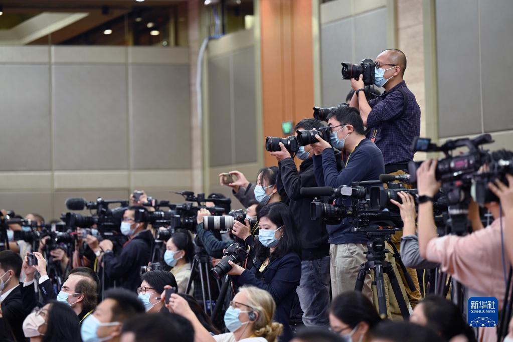 10月15日,中国共产党第二十次全国代表大会新闻发言人孙业礼在北京人民大会堂举行新闻发布会。这是媒体记者在分会场采访拍摄。