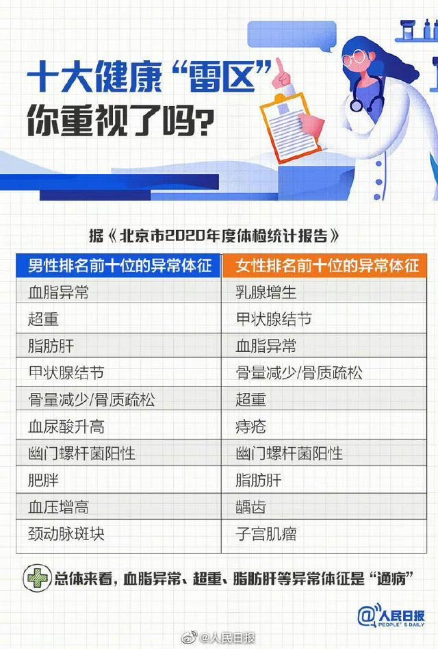 根据去年年底发布的《北京市2020年度体检统计报告》,男性女性排名前十位的“异常”体征是: