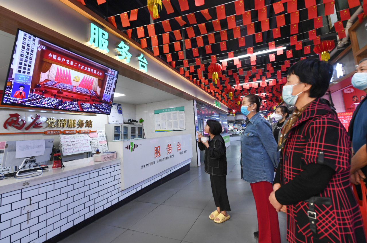 10月16日,在安徽省合肥市包河区万国农贸市场,当地市民正在收看党的二十大开幕会直播。(工人日报—中工网通讯员 张大岗 摄)