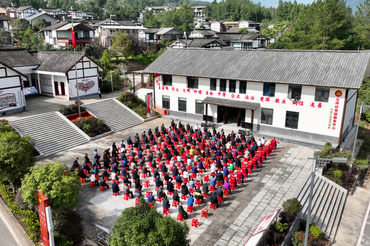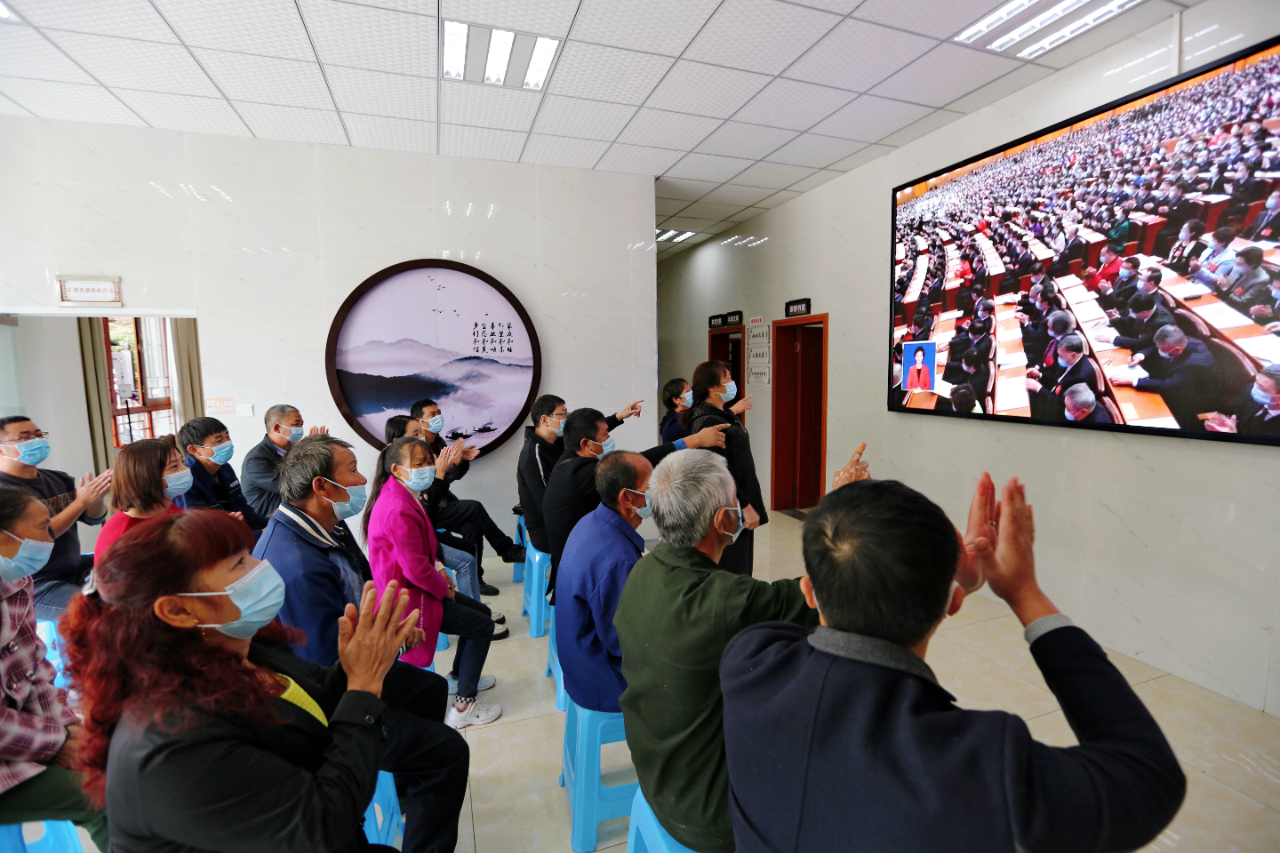 10月16日,四川省巴中市通江县沙溪镇王坪村,当地干部群众正在一起收看党的二十大开幕会直播。(工人日报—中工网通讯员 程聪 摄)