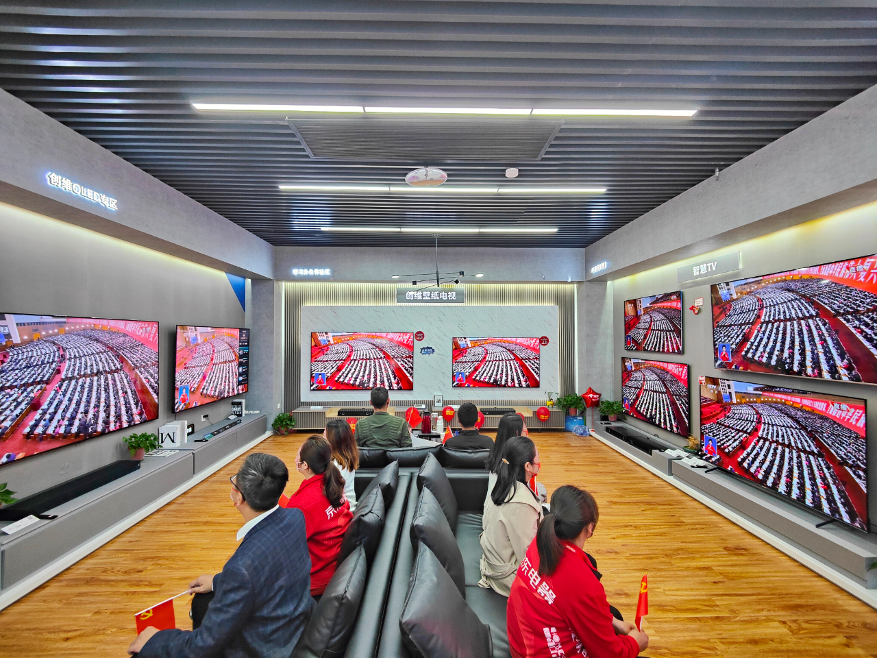 10月16日,江苏南通崇川区学田街道党员群众走进新时代文明实践“十五分钟服务圈”成员单位——京东电器的营业场所内,共同观看党的二十大开幕会直播。(工人日报—中工网通讯员 许丛军 摄)