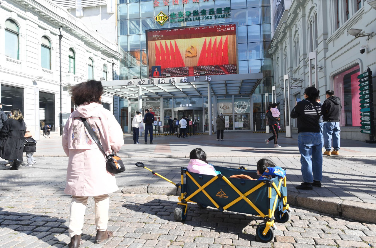 10月16日,黑龙江哈尔滨,在百年老街中央大街上,一家商场的大屏幕上正在直播党的二十大开幕会,吸引了市民驻足观看。(工人日报—中工网通讯员 刘洋 摄)