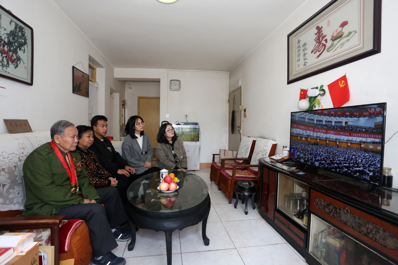 10月16日,甘肃省平凉市崆峒区西郊街道广场社区党员陪同87岁的抗美援朝老战士郑志清和老伴在家里观看党的二十大开幕会直播,共同见证这一历史时刻。(工人日报—中工网通讯员 吴希会 摄)