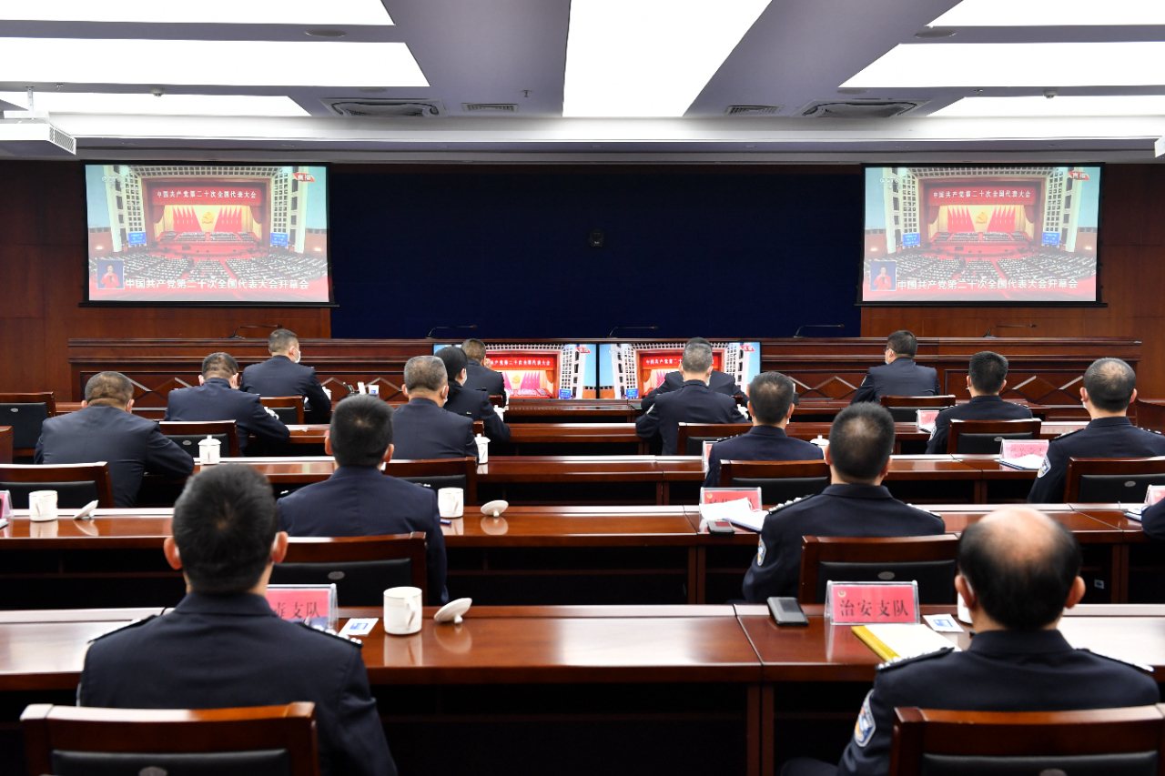 10月16日,安徽省宁国市公安局组织全局广大民警、辅警集中收看党的二十大开幕会直播。(工人日报—中工网通讯员 高鹏 摄)
