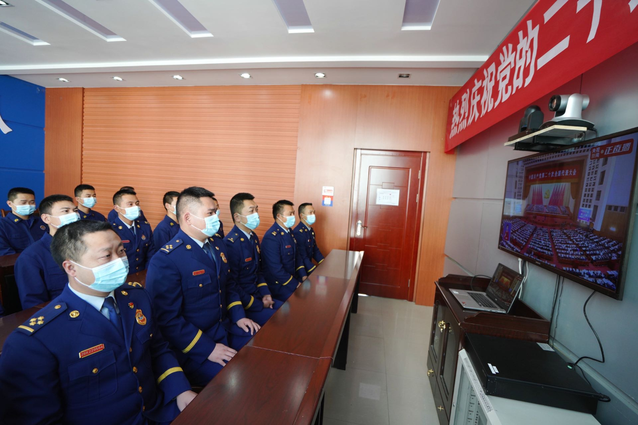 10月16日,甘肃省宕昌县消防大队集体收看党的二十大开幕会直播。(工人日报—中工网通讯员 刘辉 摄)