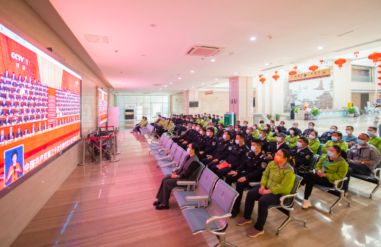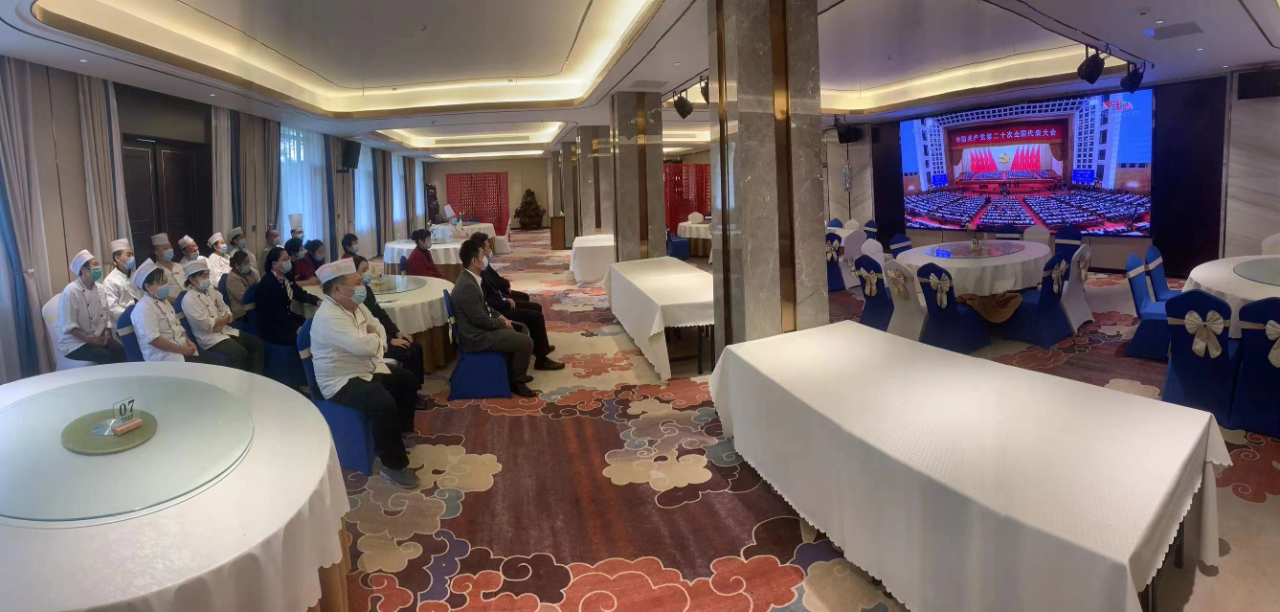 10月16日,山东健康物业集团新力公司冶金宾馆工作人员集体观看开幕会直播。(工人日报—中工网通讯员 袁弘 摄)