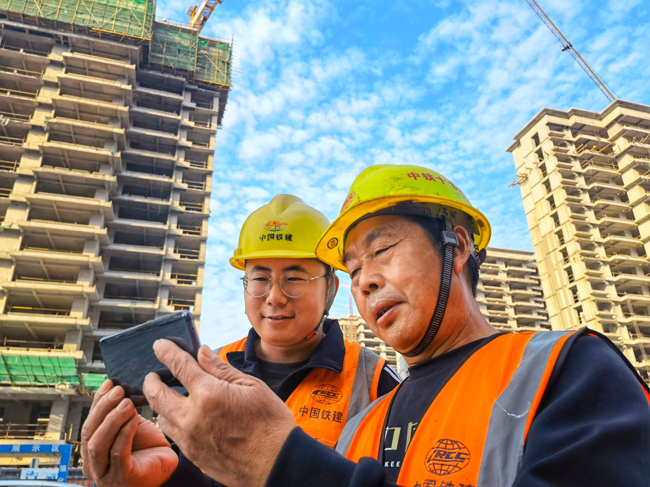 10月16日,中铁十七局集团建筑公司河南郸城棚改项目部工作人员通过手机一起收看党的二十大开幕会直播。(阿孜古丽·赛买提 摄)