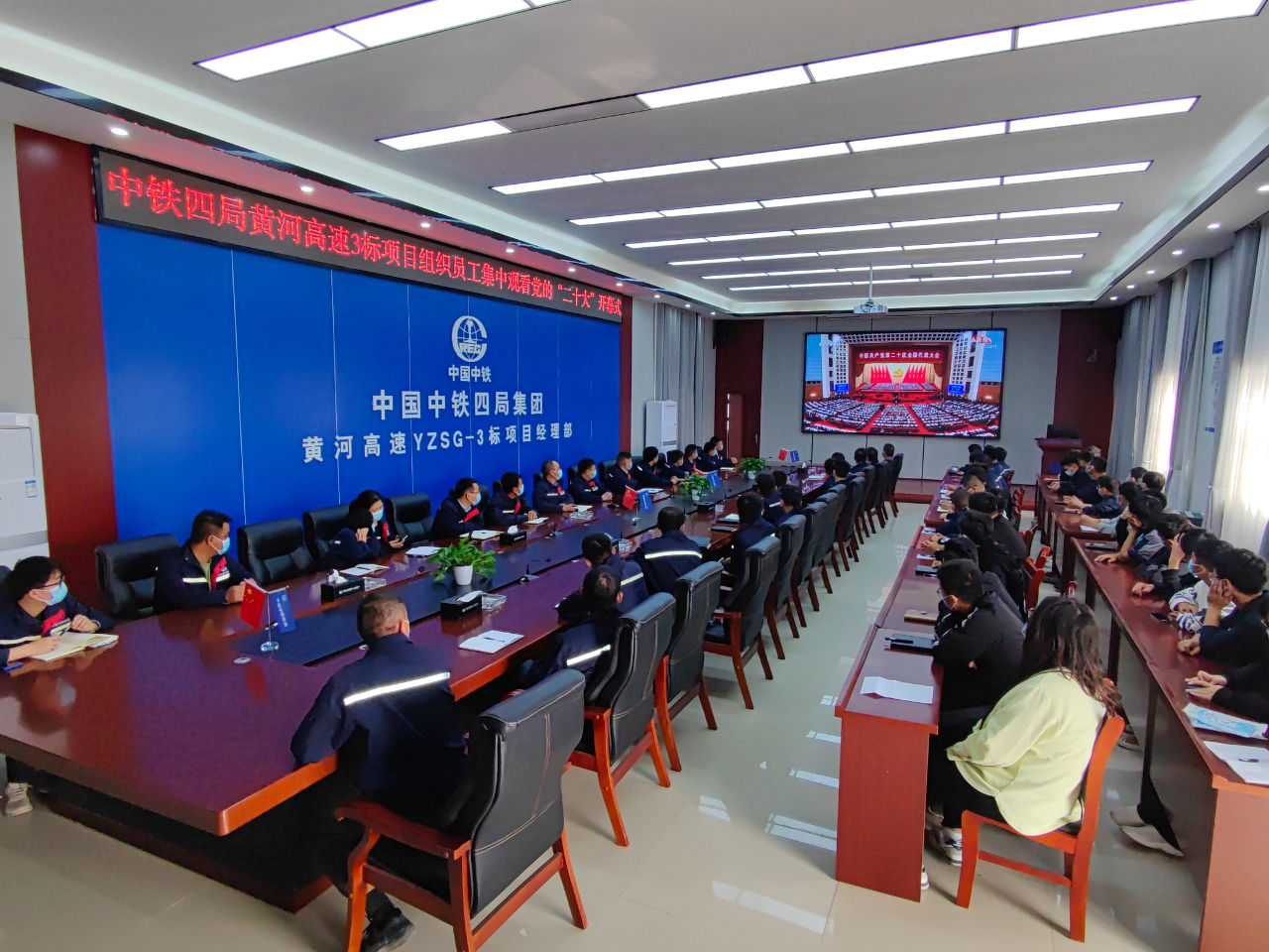 10月16日,河南郑州中牟县,中铁四局黄河高速YZSG-3标项目部全体干部职工正在观看党的二十大开幕会直播。(王仔琦 摄)