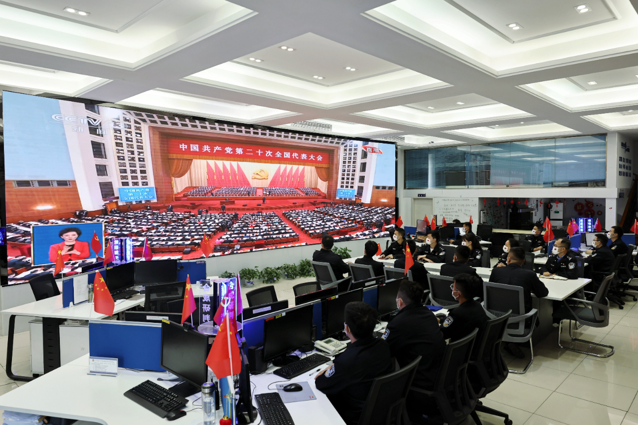 10月16日,安徽省舒城县公安局万佛湖旅游度假区派出所全体民警、辅警在景区游客大厅与游客、旅游公司职工一起收看党的二十大开幕会直播。(王冀芳 摄)