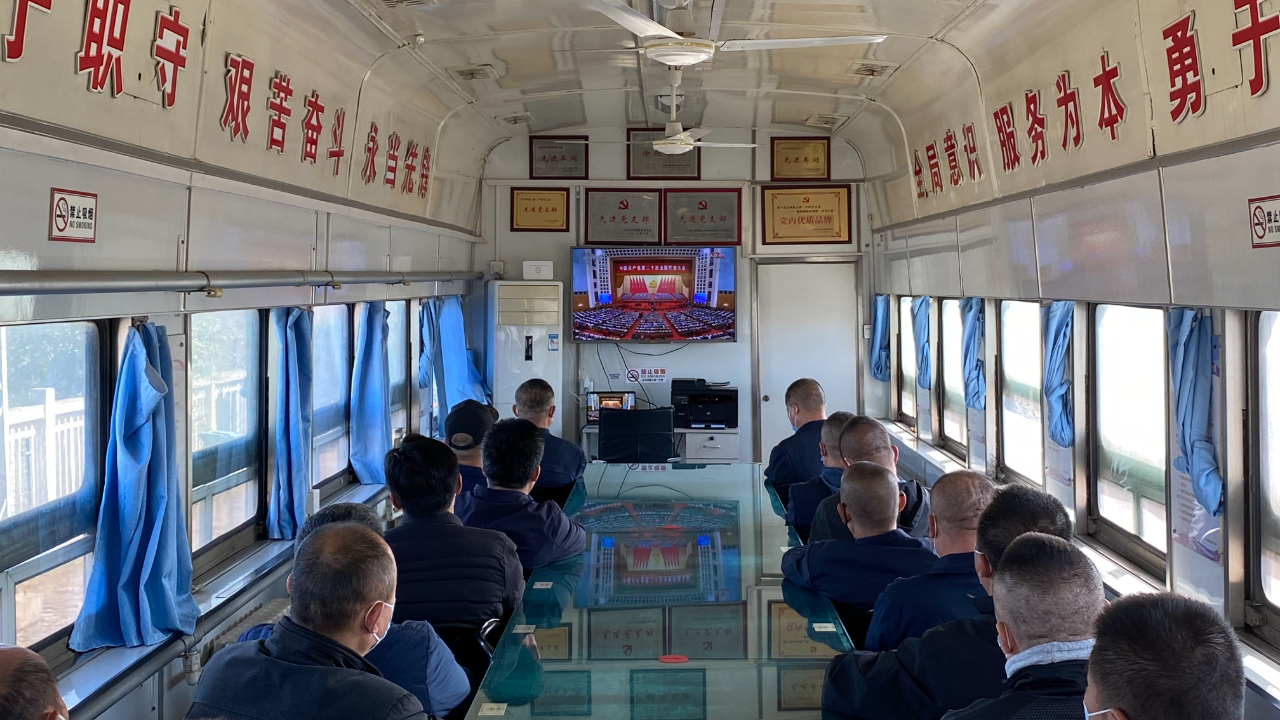 10月16日,中国铁路北京局集团有限公司北京工电大修段在保证正常生产秩序、确保现场安全、做好疫情防控的基础上,积极组织党员干部职工收看党的二十大开幕会直播。(工人日报—中工网通讯员 高志华 摄)