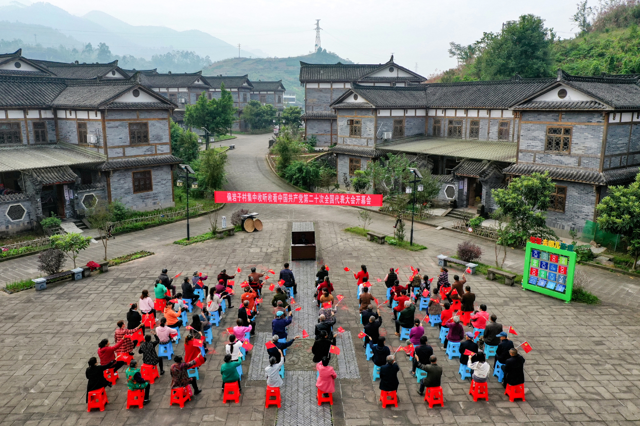 10月16日,四川华蓥市地质灾害避险搬迁安置点阳和镇偏岩子移民新村的干部群众,汇聚在广场上集中收看党的二十大开幕会直播。(工人日报—中工网通讯员 邱海鹰 摄)