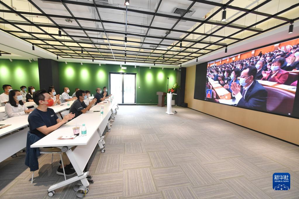 10月16日,在广东省深圳市前海深港青年梦工场北区,在前海工作的青年收看中国共产党第二十次全国代表大会开幕会。新华社记者 毛思倩 摄