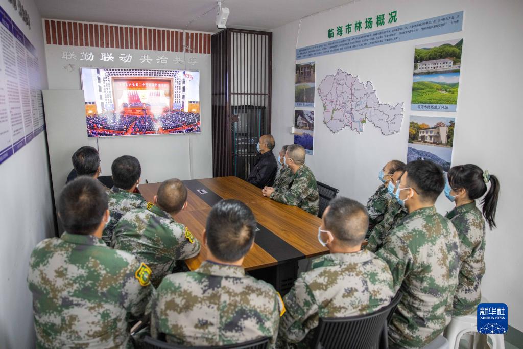 10月16日,浙江省台州临海市林场职工在位于括苍山的林场内收看中国共产党第二十次全国代表大会开幕会。新华社记者 江汉 摄