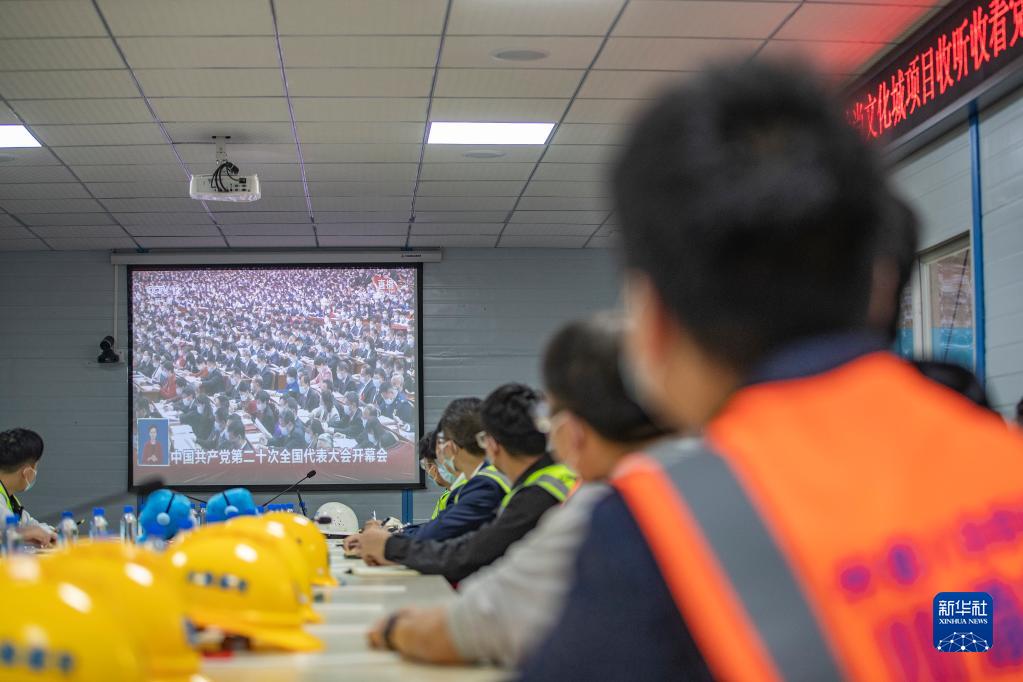 10月16日,在重庆时尚文化城项目,中建八局西南公司一线职工收看中国共产党第二十次全国代表大会开幕会。新华社记者 黄伟 摄
