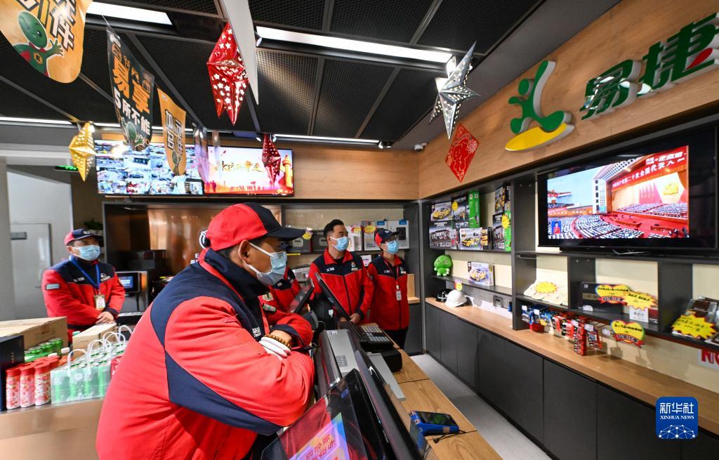 10月16日,在位于天津市南开区的中国石化销售股份有限公司天津石油分公司长江道加油站,工作人员在工作间隙观看开幕会直播。新华社记者 孙凡越 摄