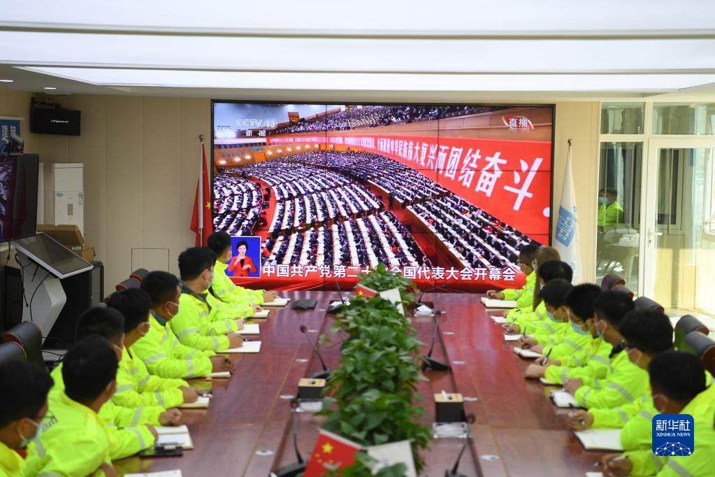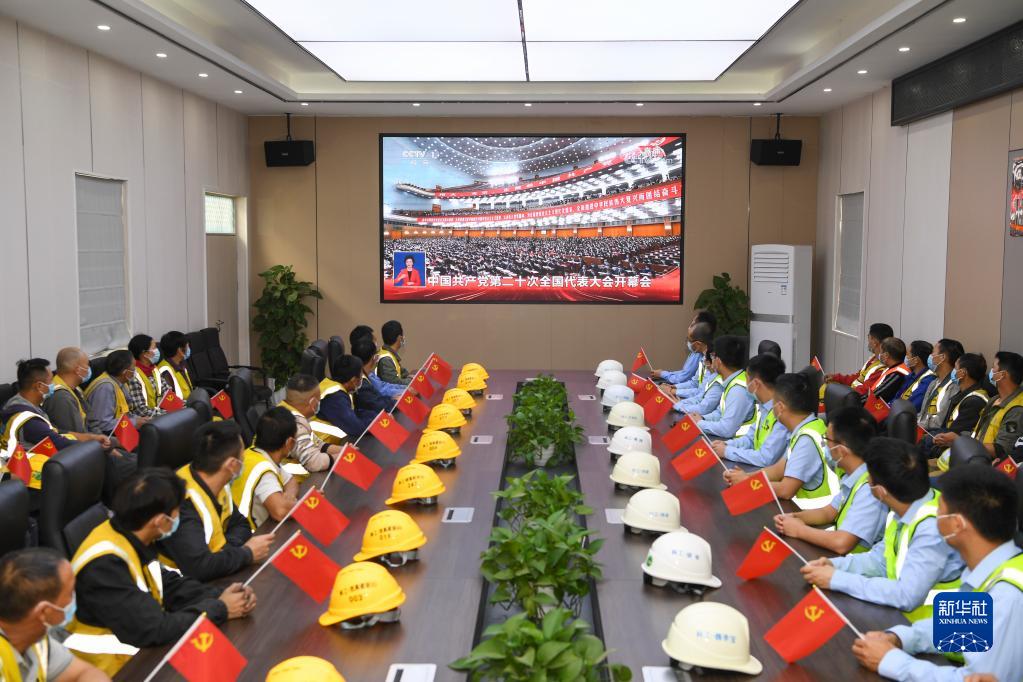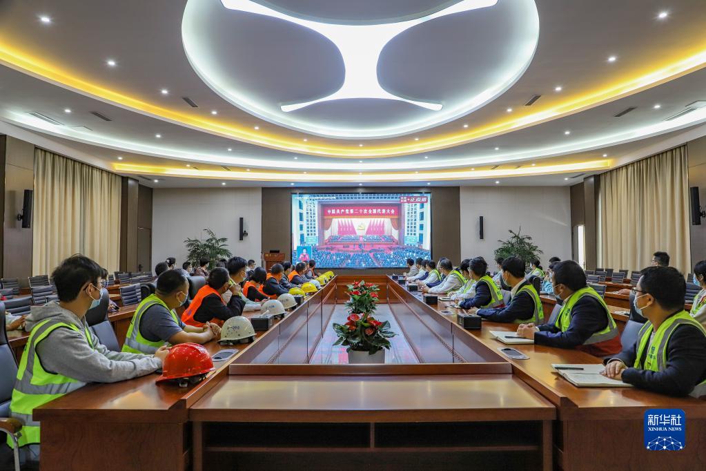 10月16日,在重庆江北国际机场T3B航站楼项目部,中建八局西南公司一线职工收看中国共产党第二十次全国代表大会开幕会。新华社发(胡晋瑜 摄)