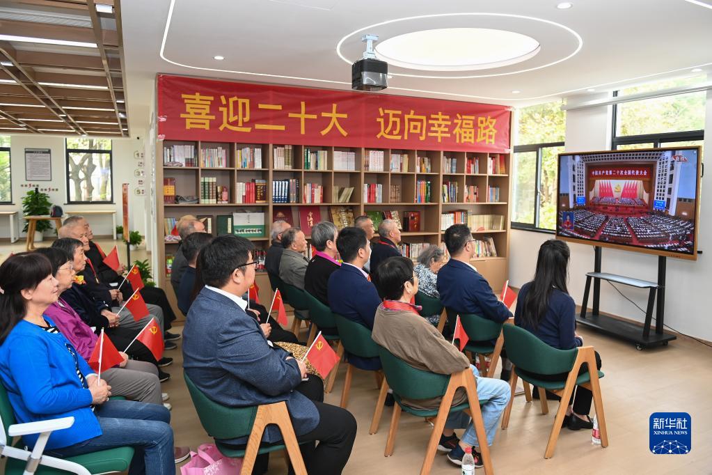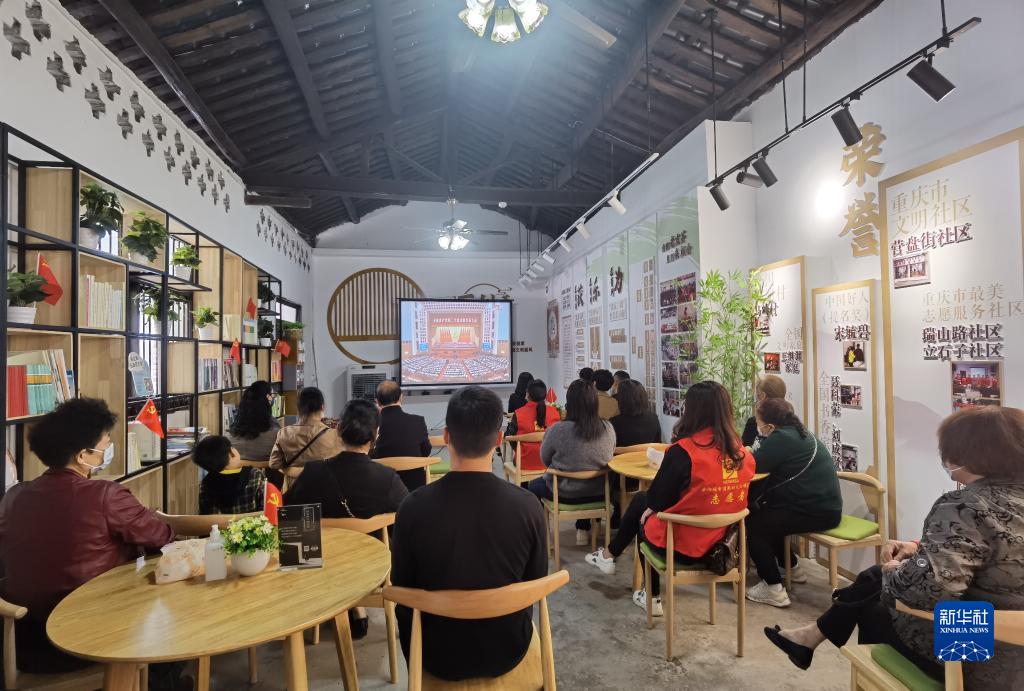 10月16日,在重庆市合川区合阳城街道新时代文明实践点,居民收看中国共产党第二十次全国代表大会开幕会。新华社发(赵宇 摄)