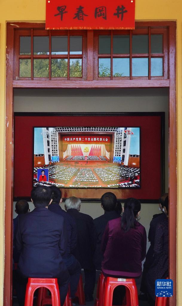 10月16日,江西省井冈山市茅坪镇神山村村民在村委会收看中国共产党第二十次全国代表大会开幕会。新华社记者 万象 摄