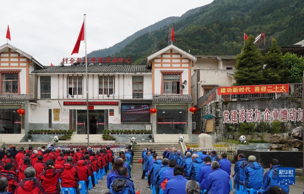 10月16日,在四川省阿坝州汶川县映秀镇渔子溪村,村民在收看中国共产党第二十次全国代表大会开幕会。新华社记者 唐文豪 摄