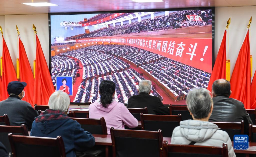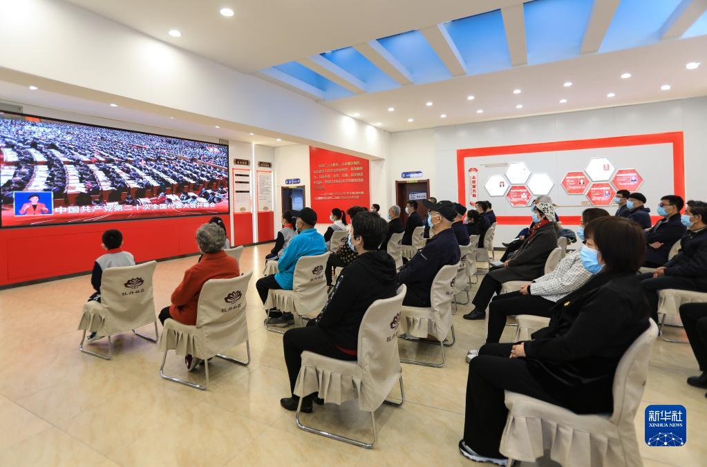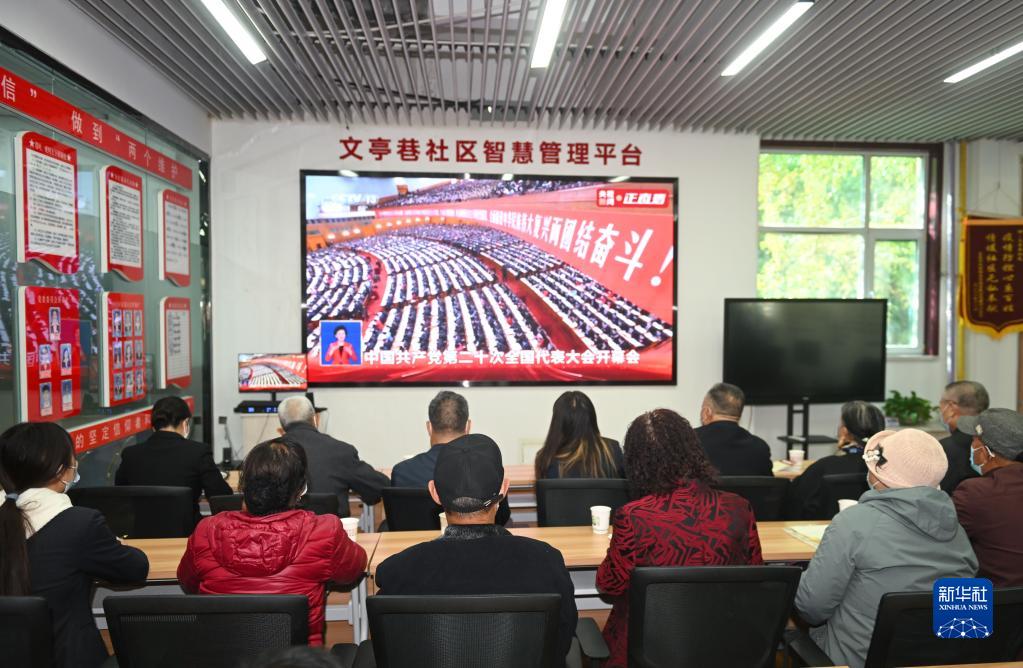 10月16日,在青海省西宁市城西区文亭巷社区党群服务中心,居民在收看中国共产党第二十次全国代表大会开幕会。新华社记者 张龙 摄