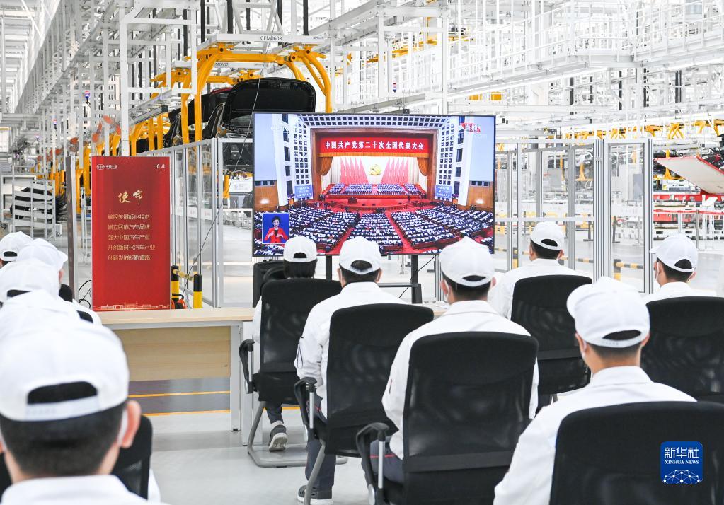 10月16日,在吉林省长春市中国第一汽车集团有限公司红旗繁荣工厂,职工在收看中国共产党第二十次全国代表大会开幕会。新华社记者 颜麟蕴 摄