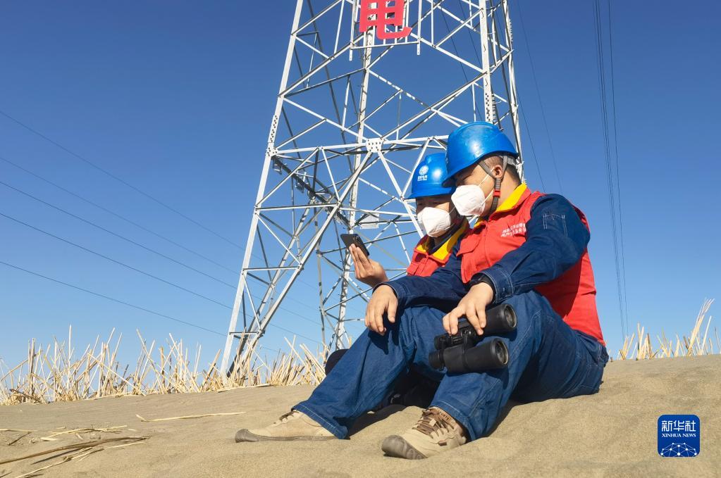 10月16日,在塔克拉玛干沙漠中,新疆和田供电公司保电人员在巡视110千伏输电线路途中,通过手机收看中国共产党第二十次全国代表大会开幕会。新华社发(唐海军 摄)