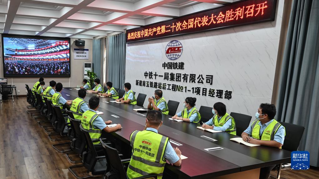 10月16日,广西南玉铁路玉林北站项目建设者在收看中国共产党第二十次全国代表大会开幕会。新华社记者 张爱林 摄