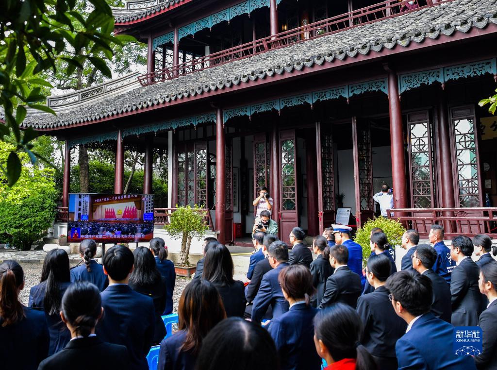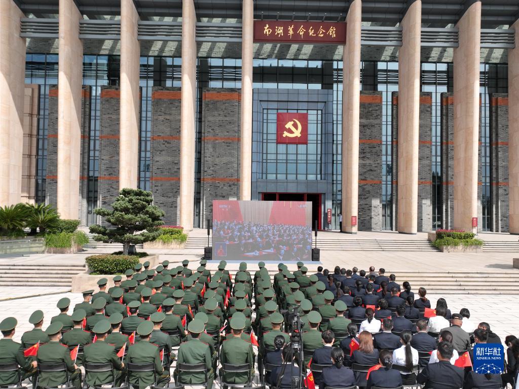 10月16日,浙江嘉兴南湖区的党员在南湖湖心岛收看中国共产党第二十次全国代表大会开幕会。新华社记者 徐昱 摄