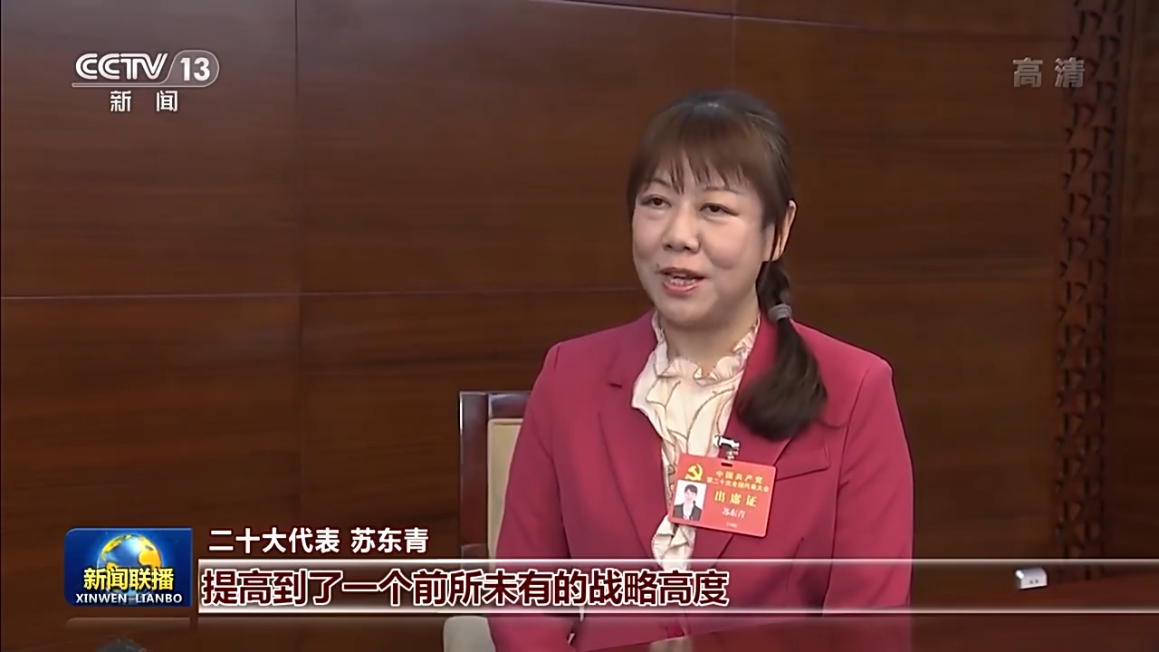 二十大代表 苏东青:这次把科教兴国、文化强国提高到了一个前所未有的战略高度。传承中华优秀传统文化、立德树人、办好人民满意的教育是我们这一代人的责任。我们始终牢记习近平总书记殷殷嘱托,让非物质文化遗产绽放出更加迷人的光彩。