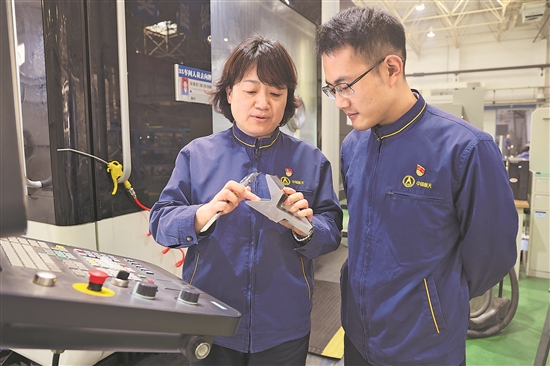 “张占军、岳敏劳模创新工作室”第二代劳模岳敏(图左)教第四代劳模吴焯琳利用五轴设备加工复合角度零件的技巧。雍楚曼 摄